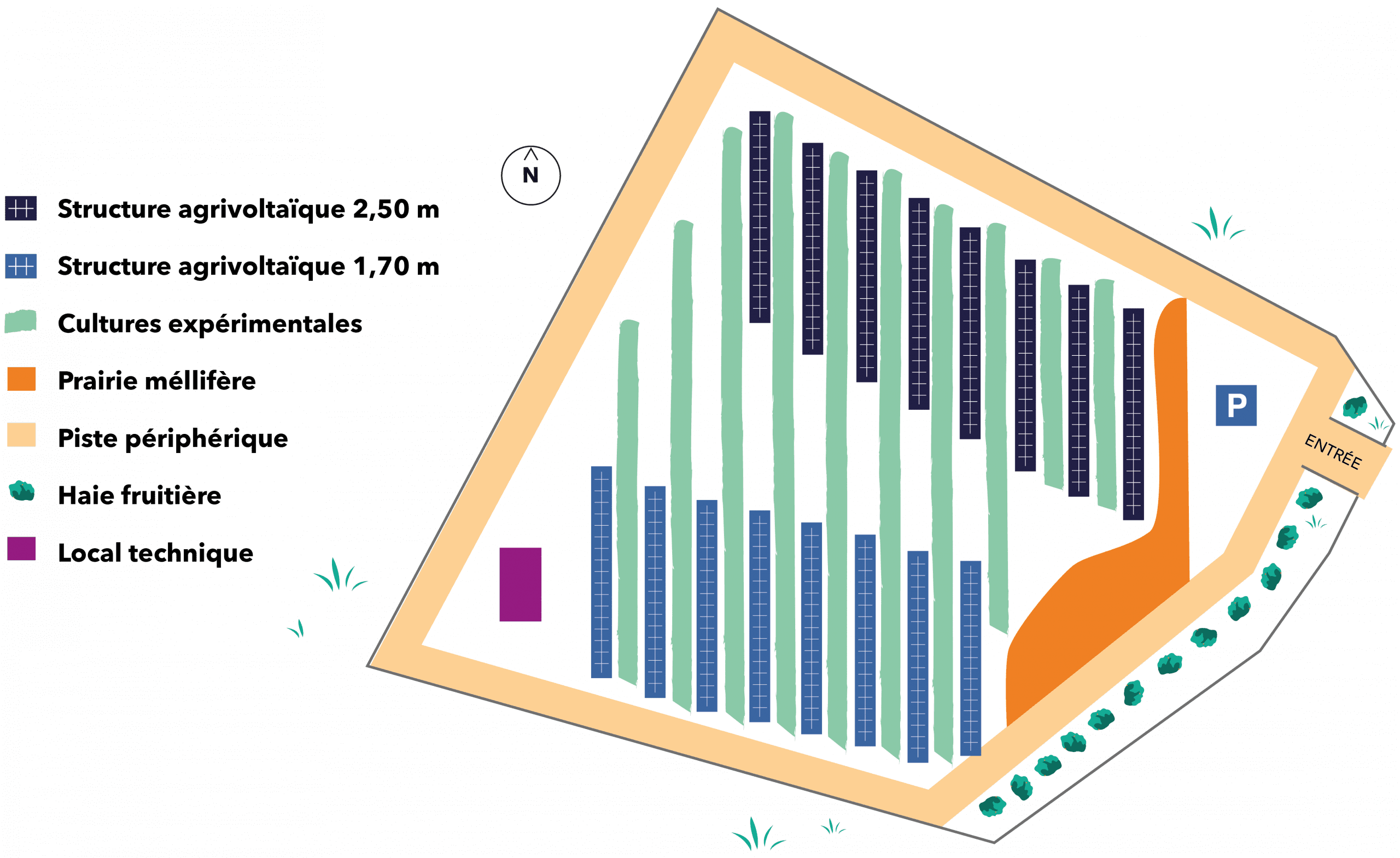 L’objectif de cette plateforme expérimentale est d’identifier les interactions entre différentes cultures pérennes et annuelles et les structures agrivoltaïques de type tracker afin d’identifier les synergies envisageables.